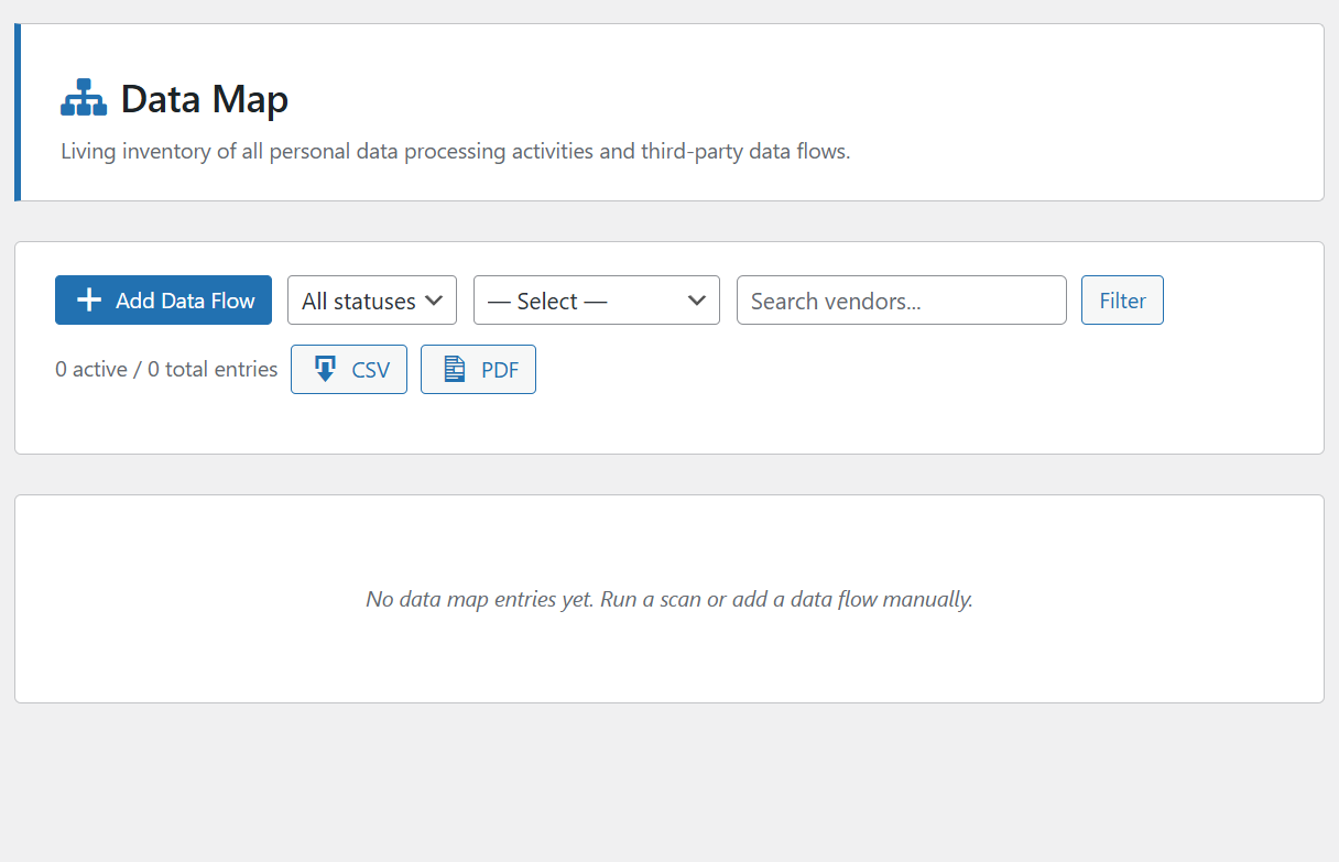 Every change to the data map (new detection, manual edit, approval) is logged with a timestamp and the WordPress user who made the change. View the history at Data Map → History.