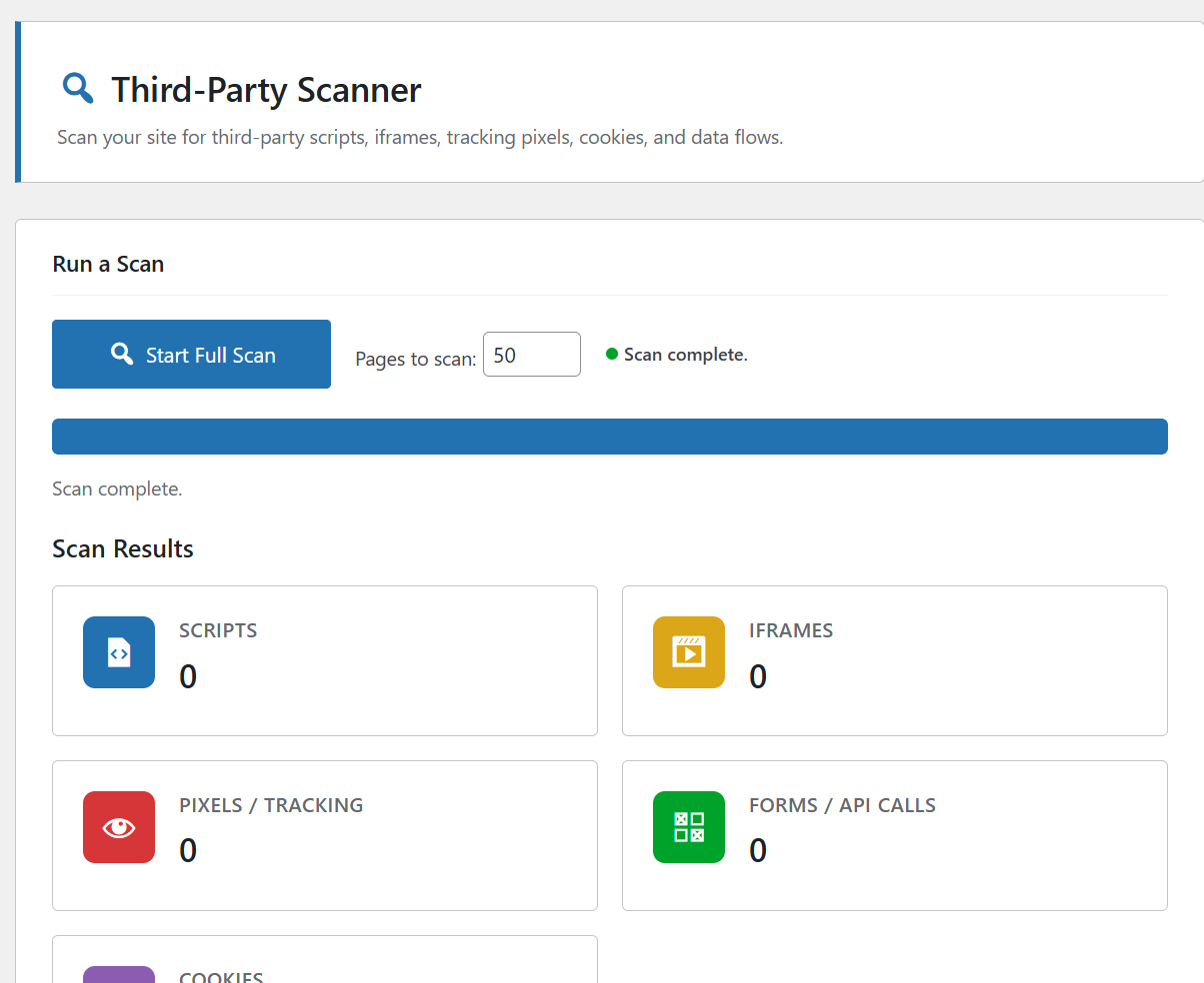 <script>tags,<iframe>elements, pixel images, and fetch/XHR calls to third-party domains - Identifies cookies set by each resource and classifies them by type