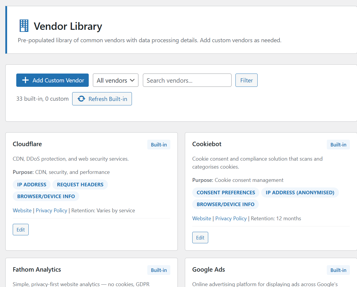 DPOKit ships with a library of 100+ common vendors with pre-filled descriptions. Administrators can: