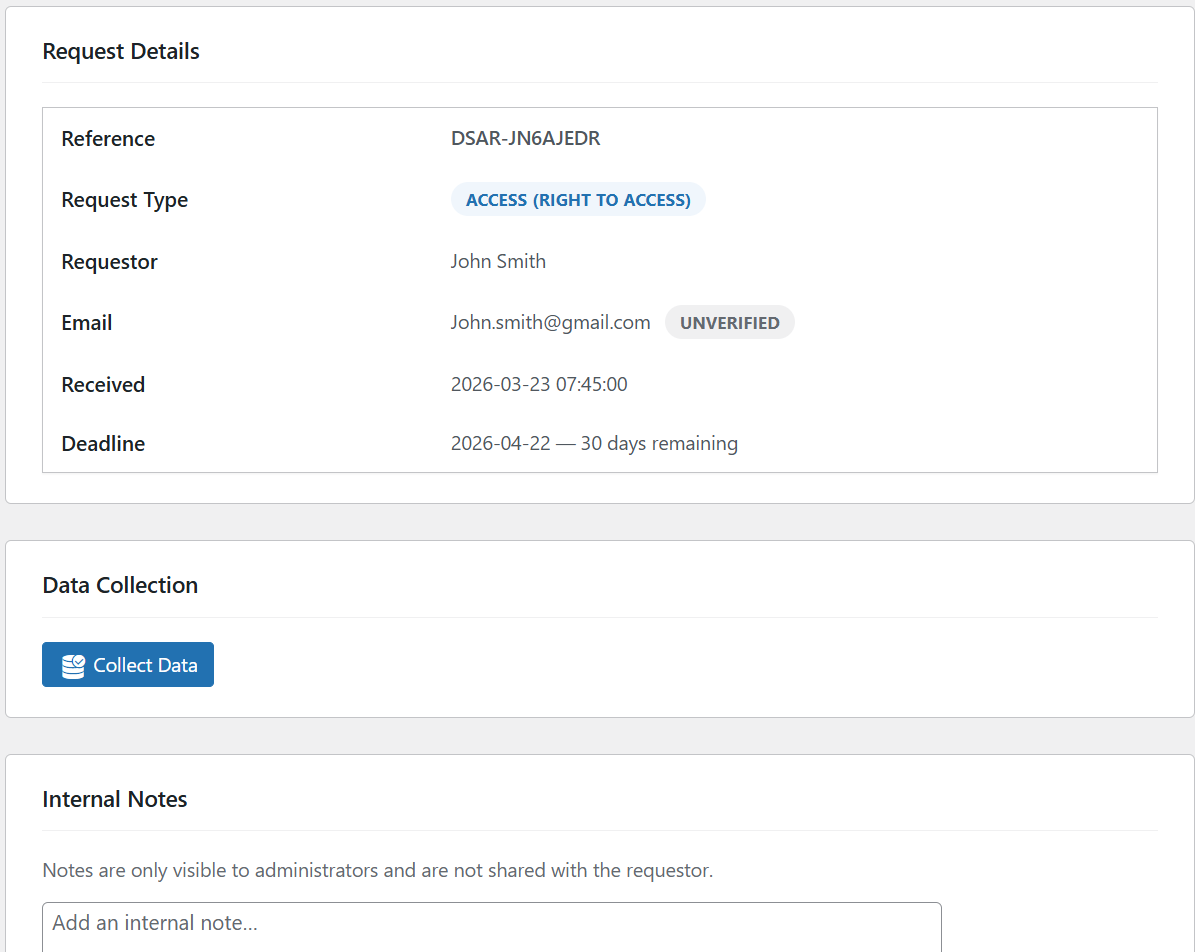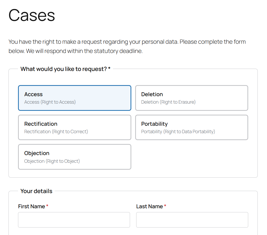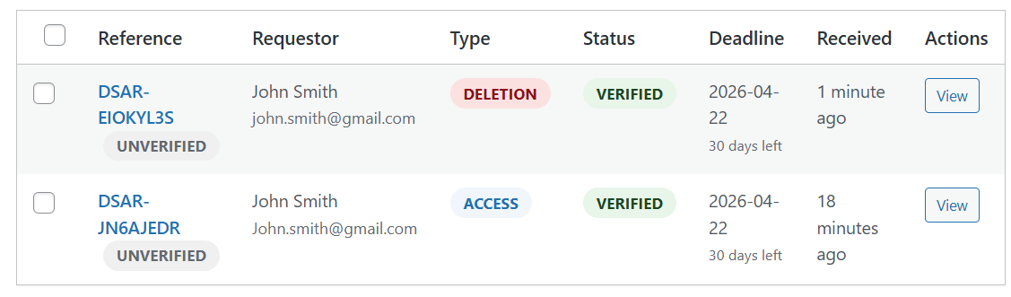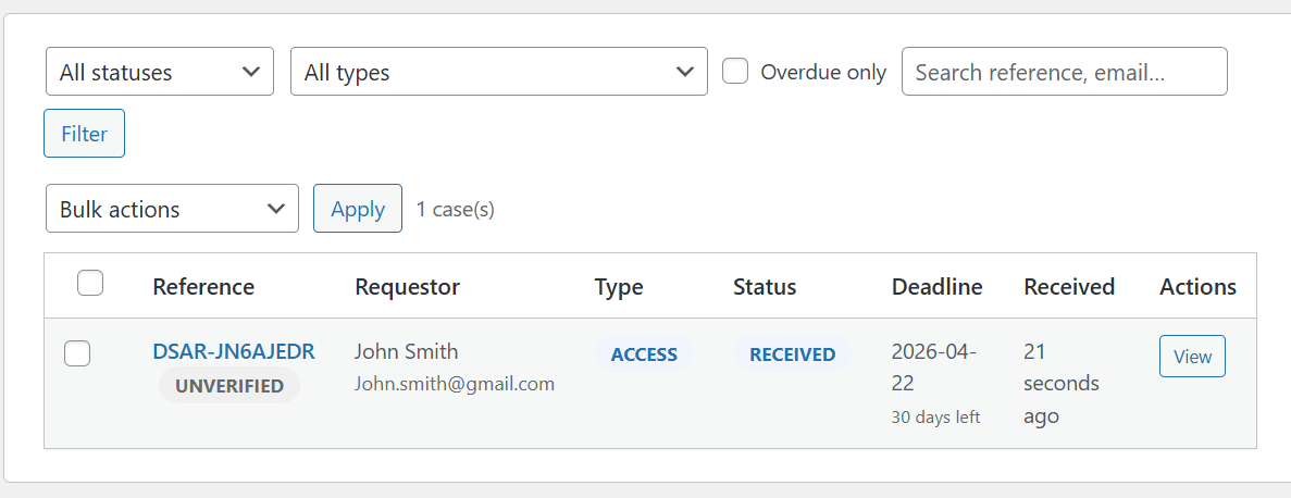 On submission, the requestor receives an acknowledgement email with a reference number and the statutory deadline (30 days by default, configurable).
