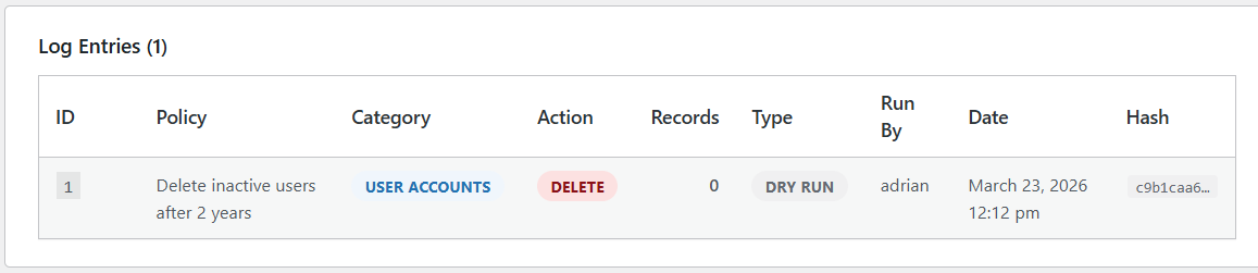 error_log( "Retention: {$action} {$count} records for policy '{$policy_id}'" );
