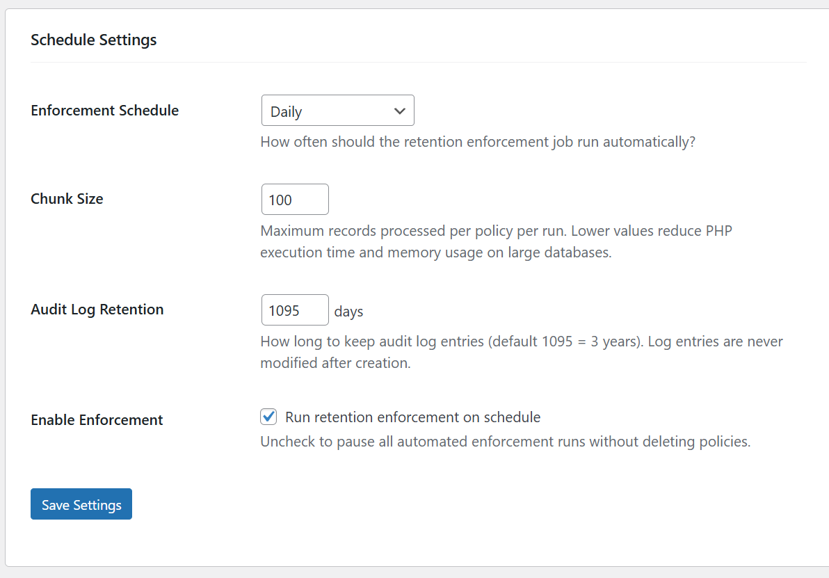 Large-scale enforcement jobs are chunked to avoid PHP timeouts and database overload. The default chunk size is 500 records per batch, with a configurable delay between batches.