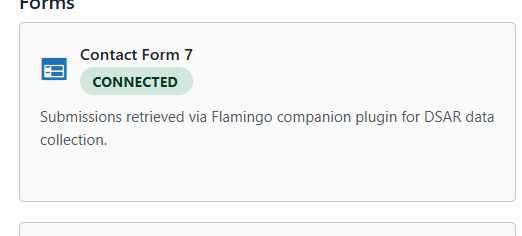 Note: Contact Form 7 does not store submissions in the WordPress database by default. Install and activate the Flamingo plugin to enable submission storage, which is required for DSAR data collection and retention enforcement.